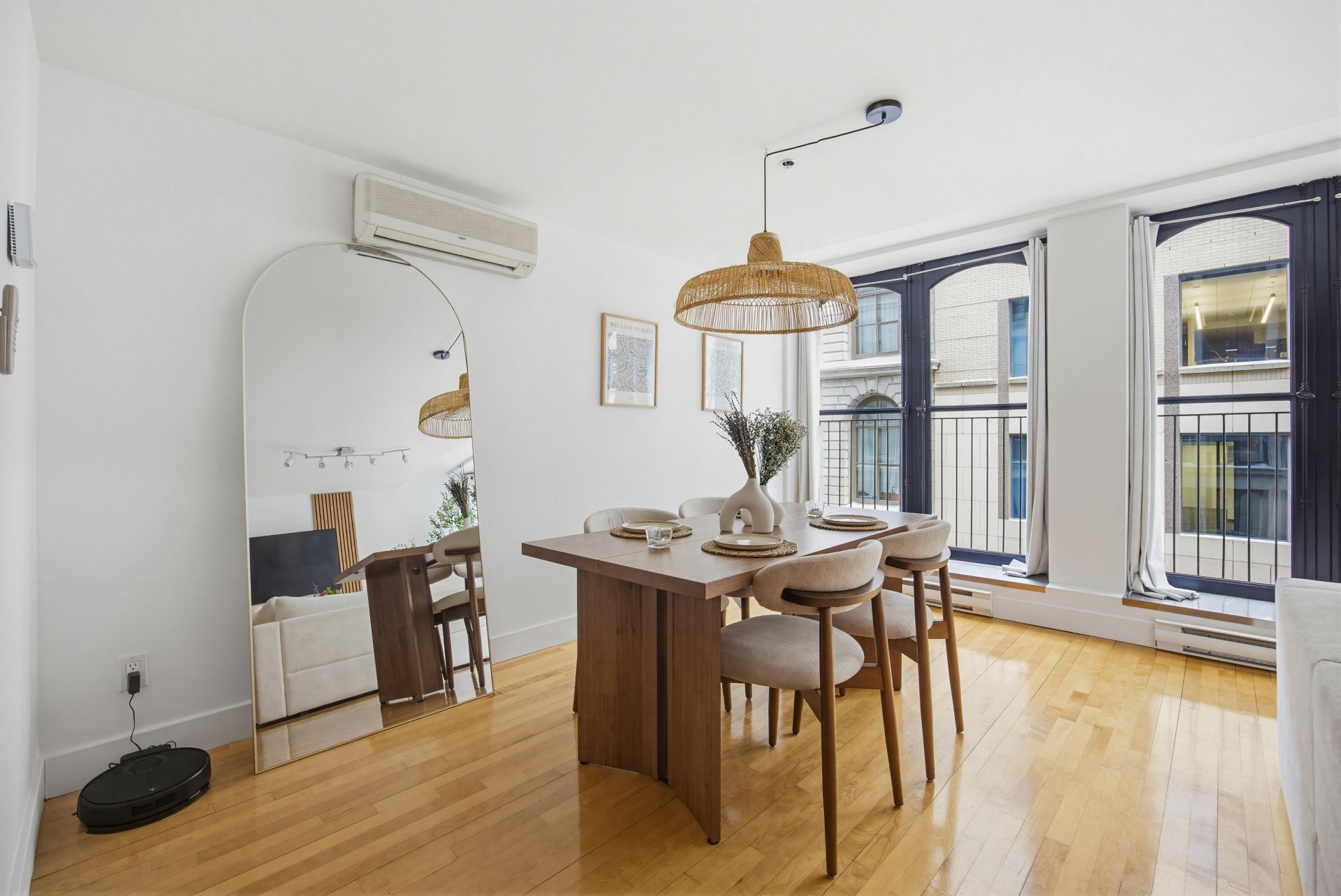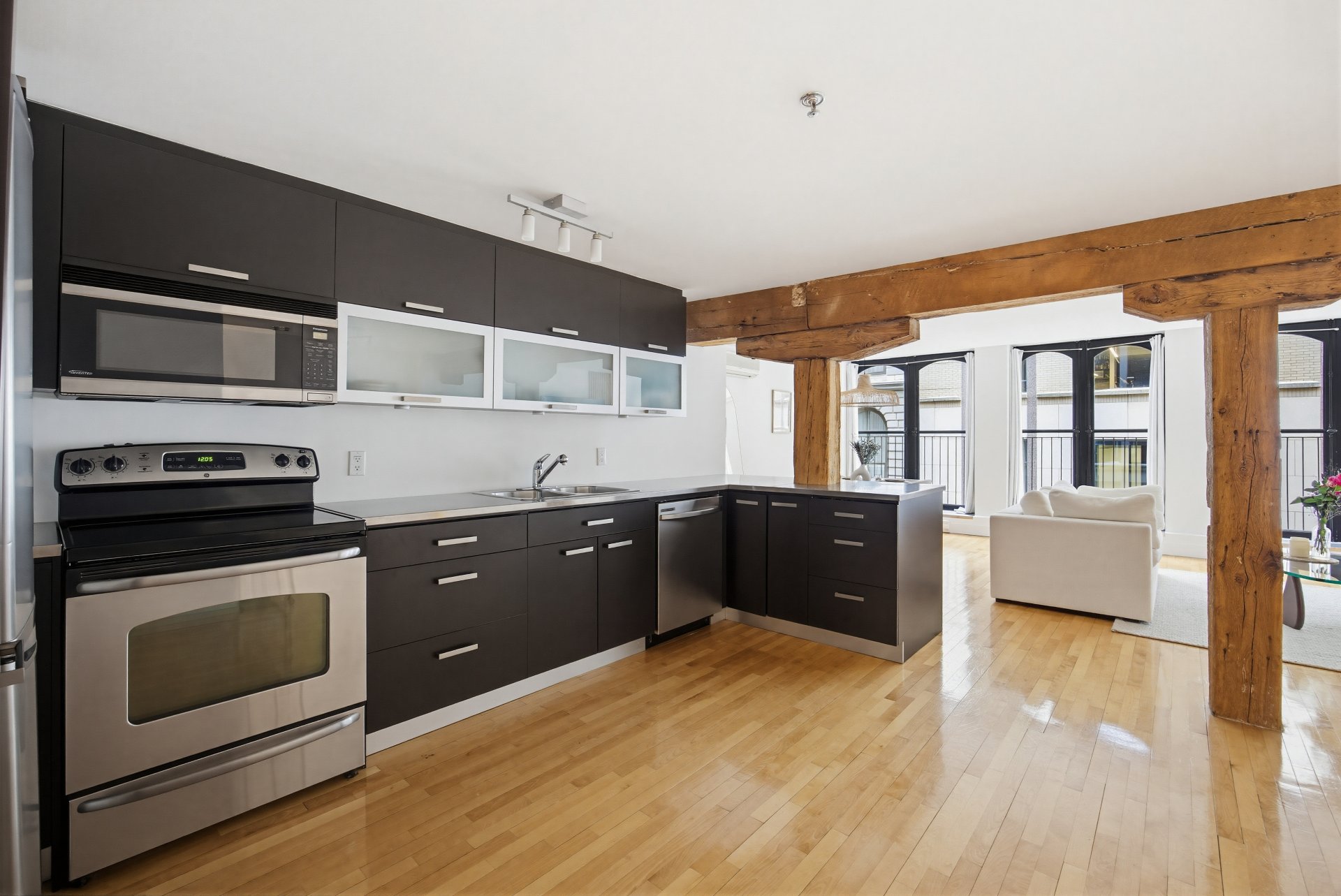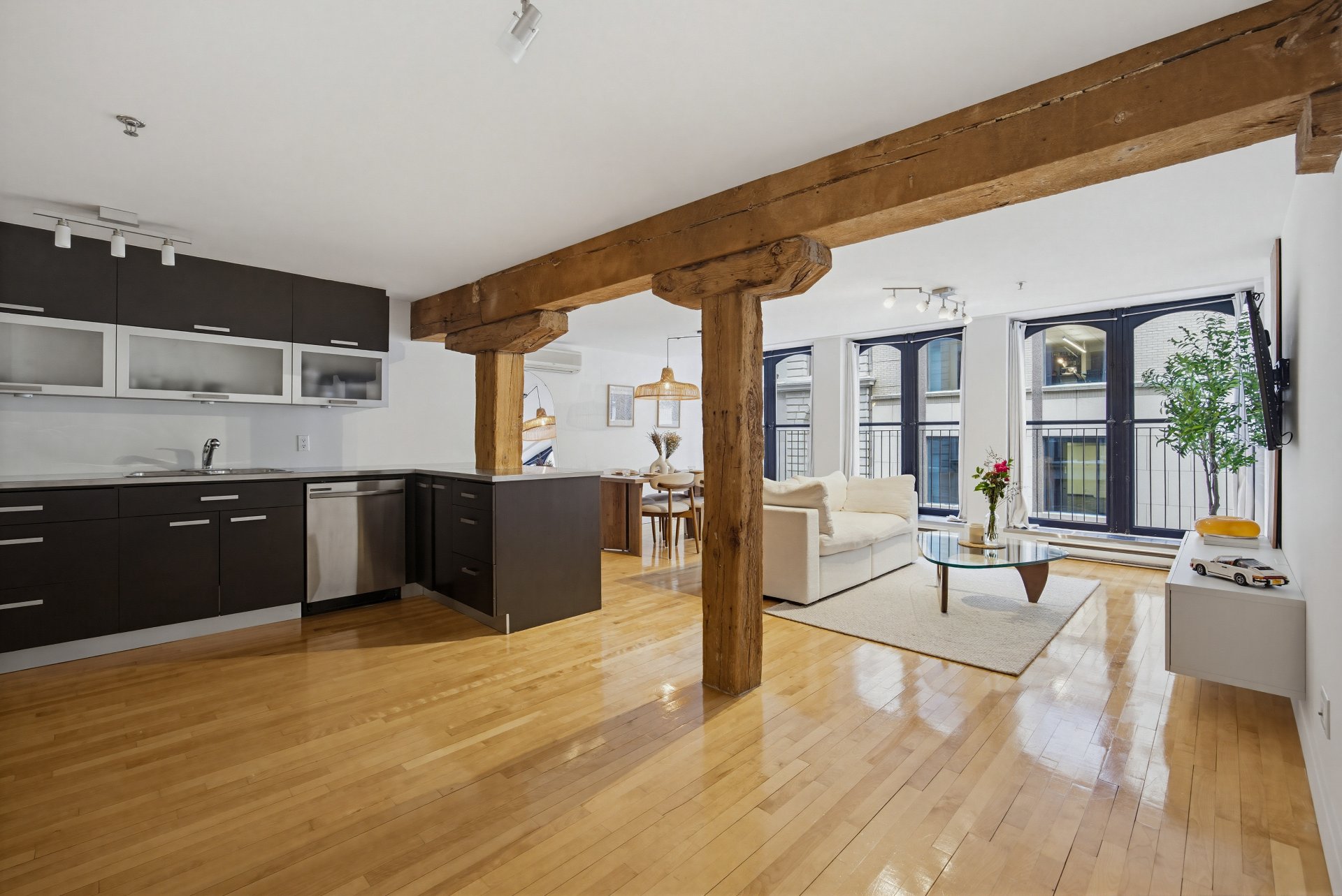 Stunning loft featuring one bedroom, a full bathroom and a powder room. This open-concept unit stands out with its beautiful exposed wood beams, high ceilings, large arched windows, and architectural columns that give the space a distinctive character. Ideally located in Old Montreal, just steps from the Old Port and close to all amenities: restaurants, cafés, grocery stores, public transportation, universities, and bike paths.