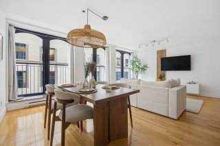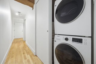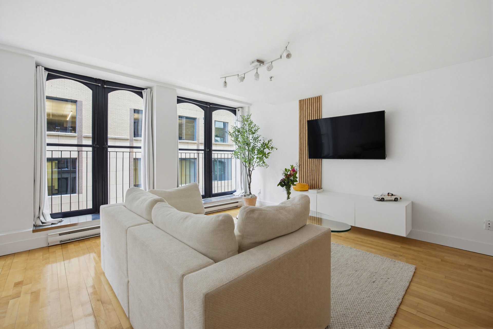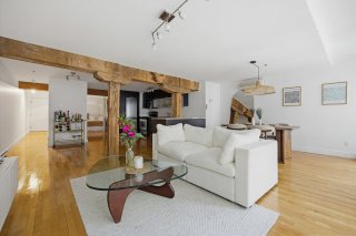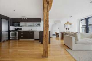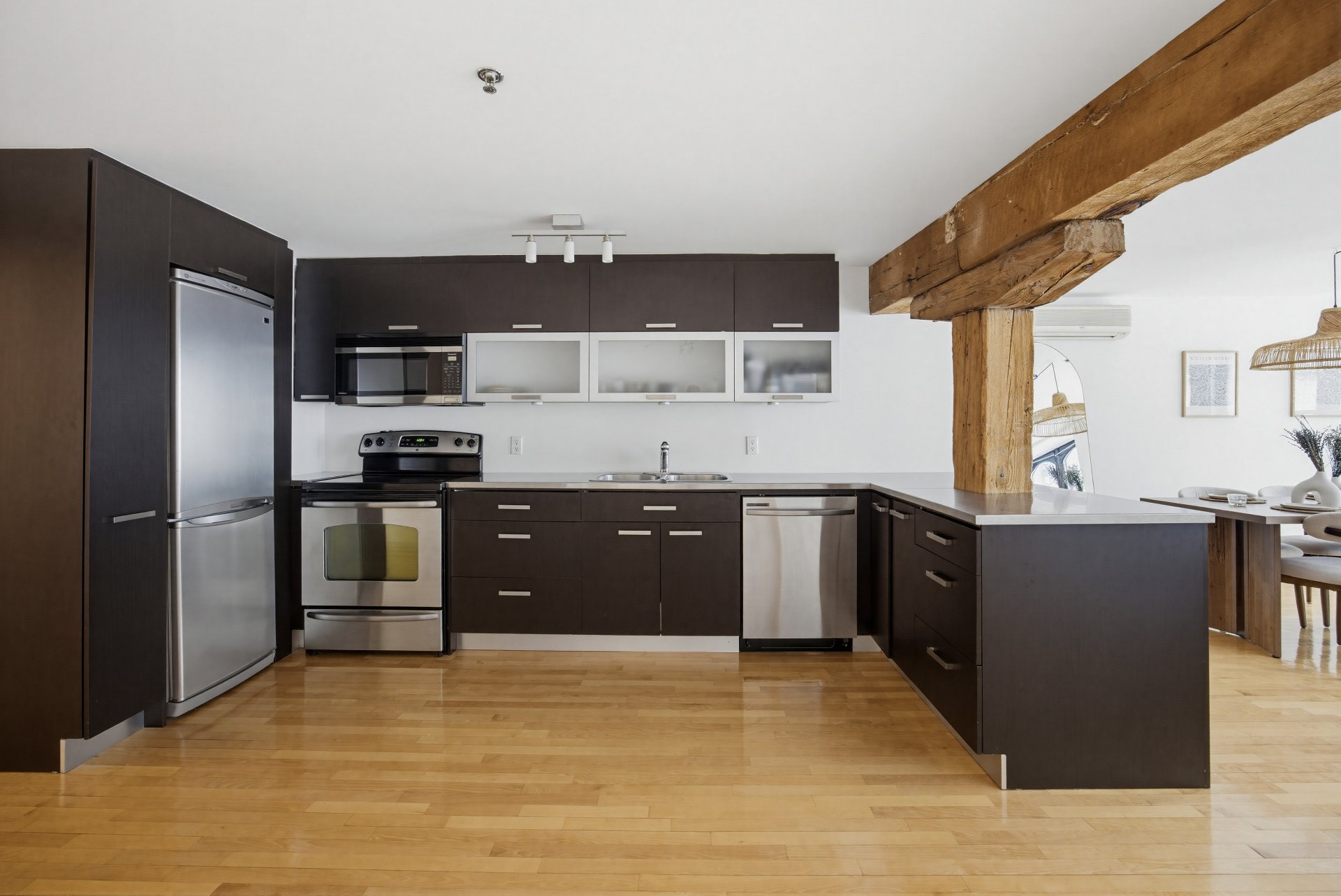 Stunning loft featuring one bedroom, a full bathroom and a powder room. This open-concept unit stands out with its beautiful exposed wood beams, high ceilings, large arched windows, and architectural columns that give the space a distinctive character. Ideally located in Old Montreal, just steps from the Old Port and close to all amenities: restaurants, cafés, grocery stores, public transportation, universities, and bike paths.