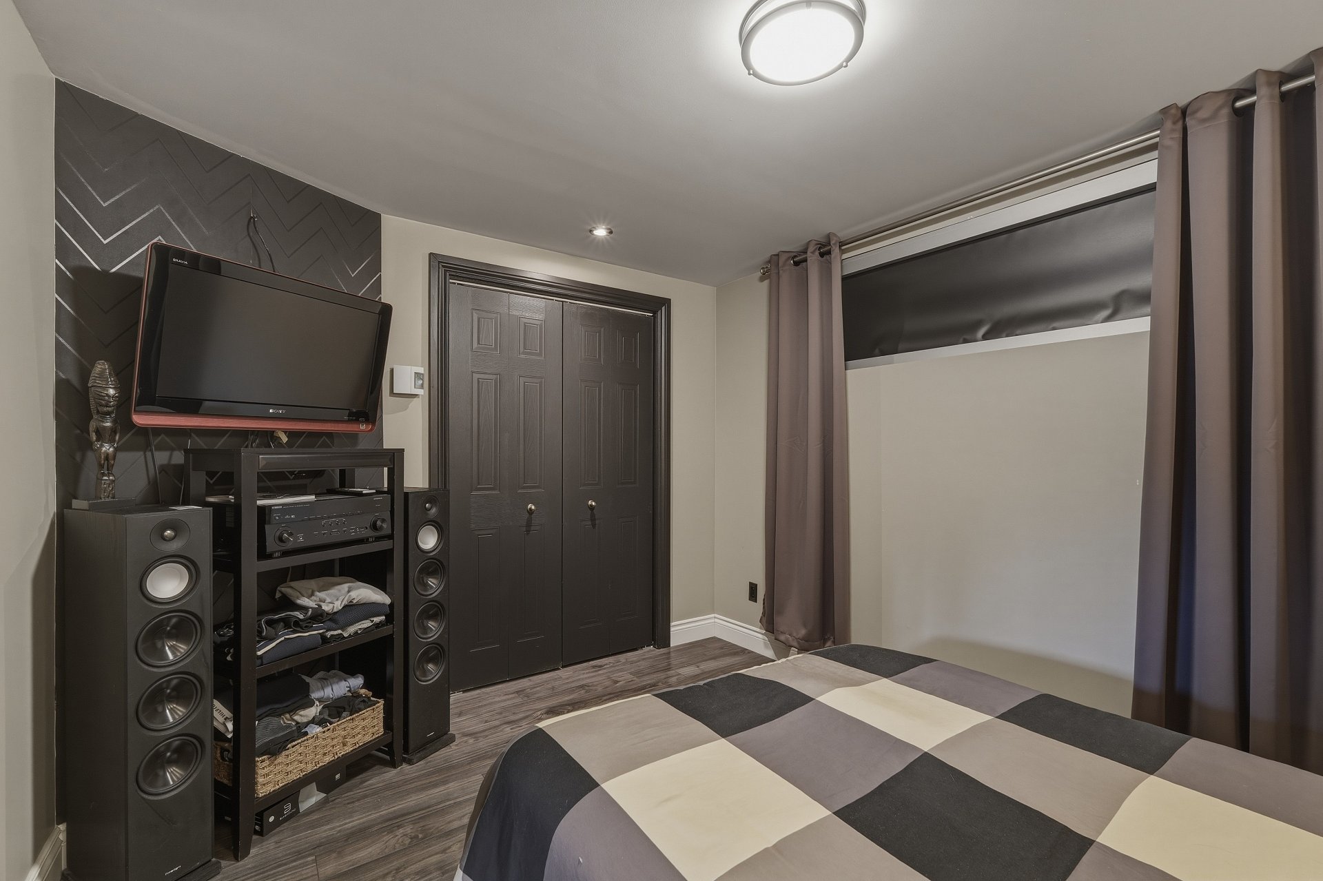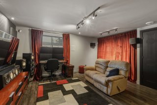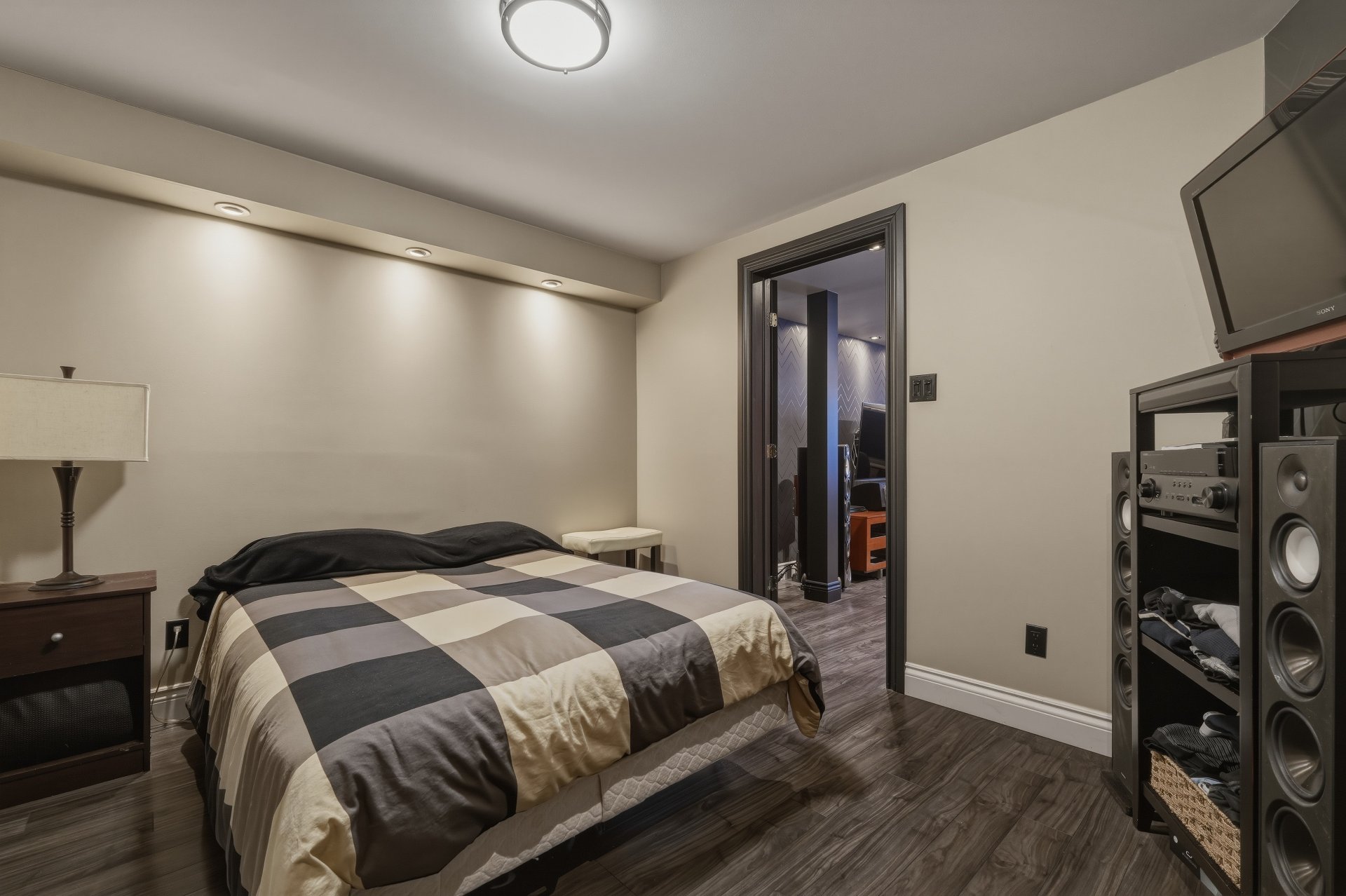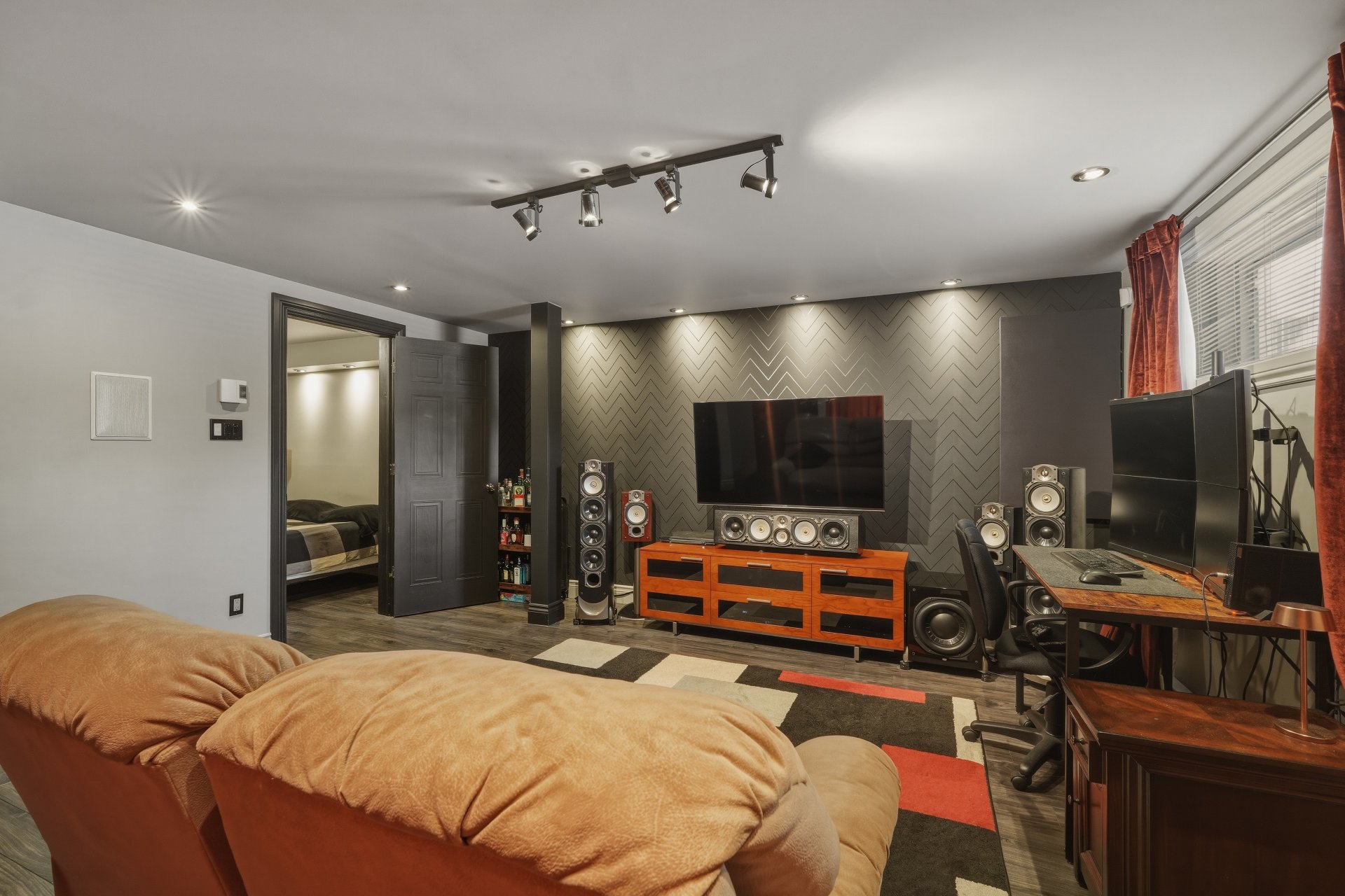 - Sous-sol aménagé pour cinéma maison (système 7.1), incluant deux haut-parleurs encastrés Paradigm, plafond avec gypse doublé et isolation supérieure