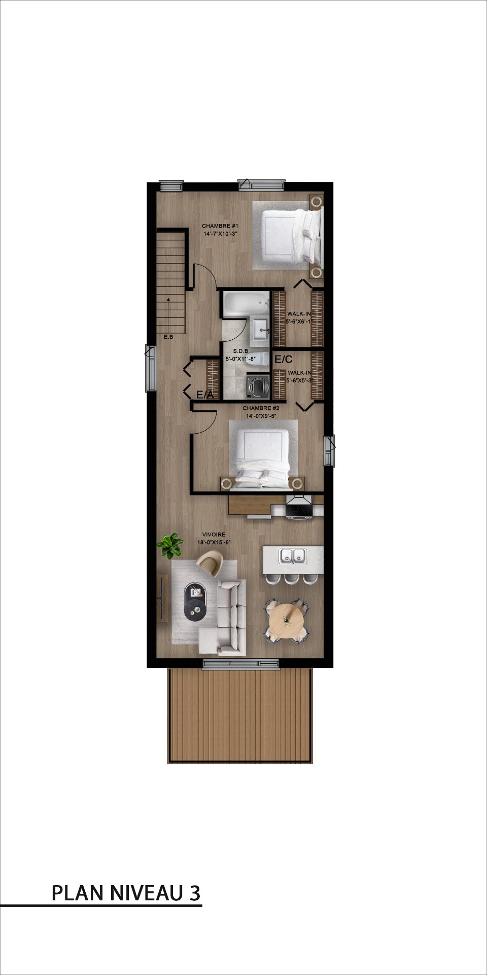 | Penderie (Walk-in) | 6.8 x 5.6 P | 3ième étage | Couvre-sol souple |