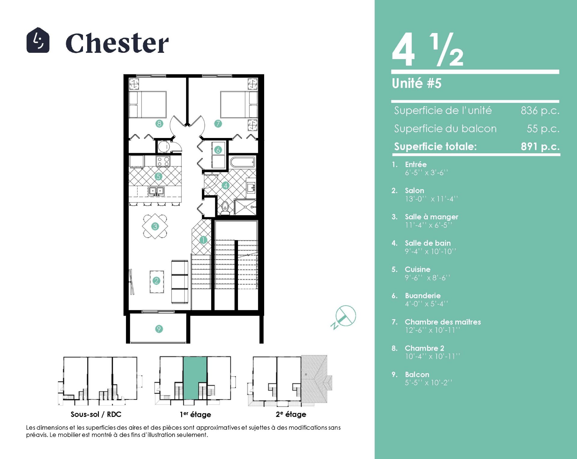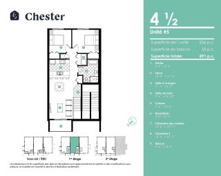 | Salon | 13.0 x 11.4 P | Rez-de-chaussée | Plancher flottant |