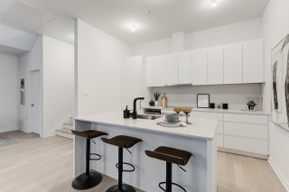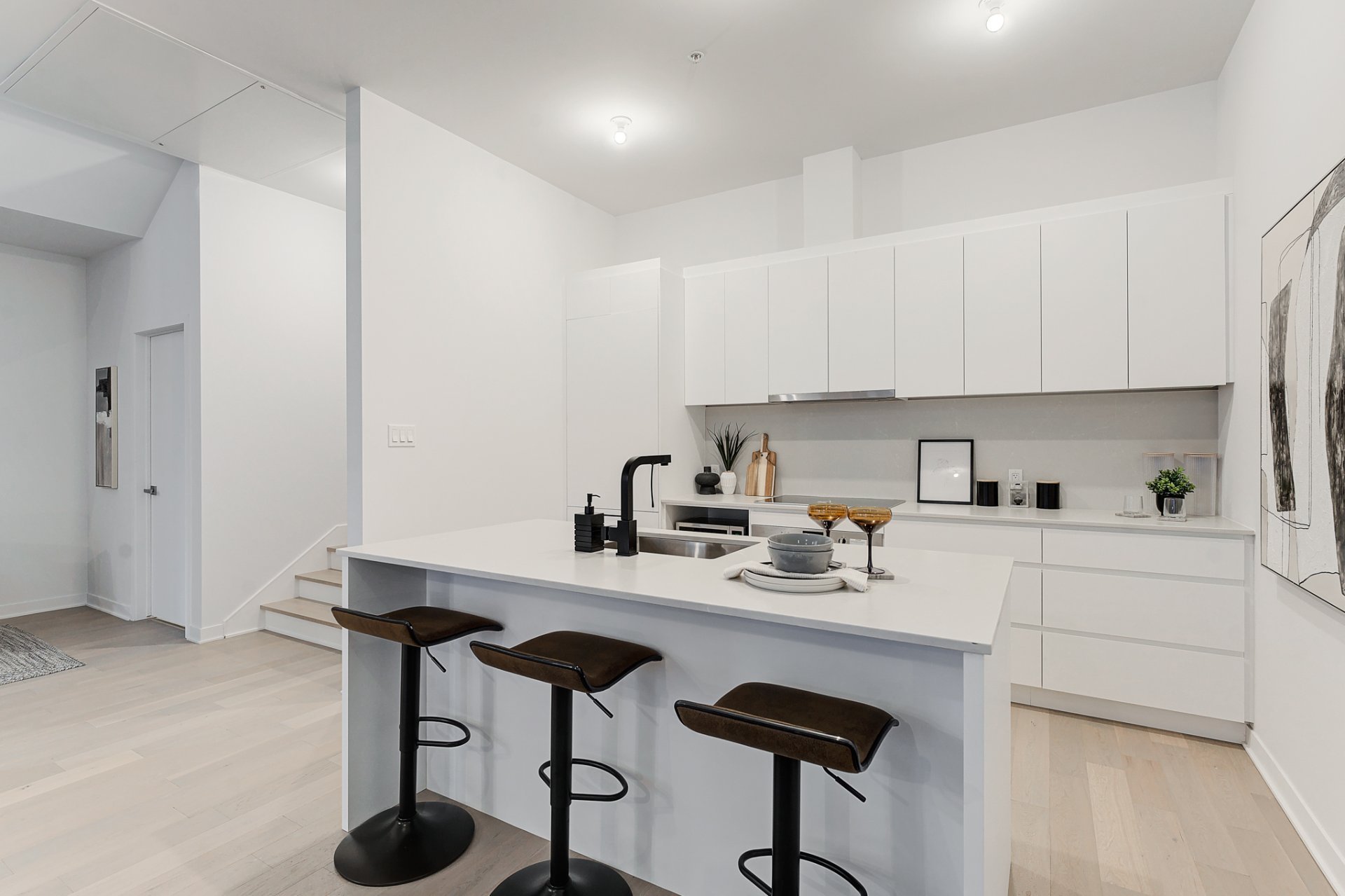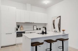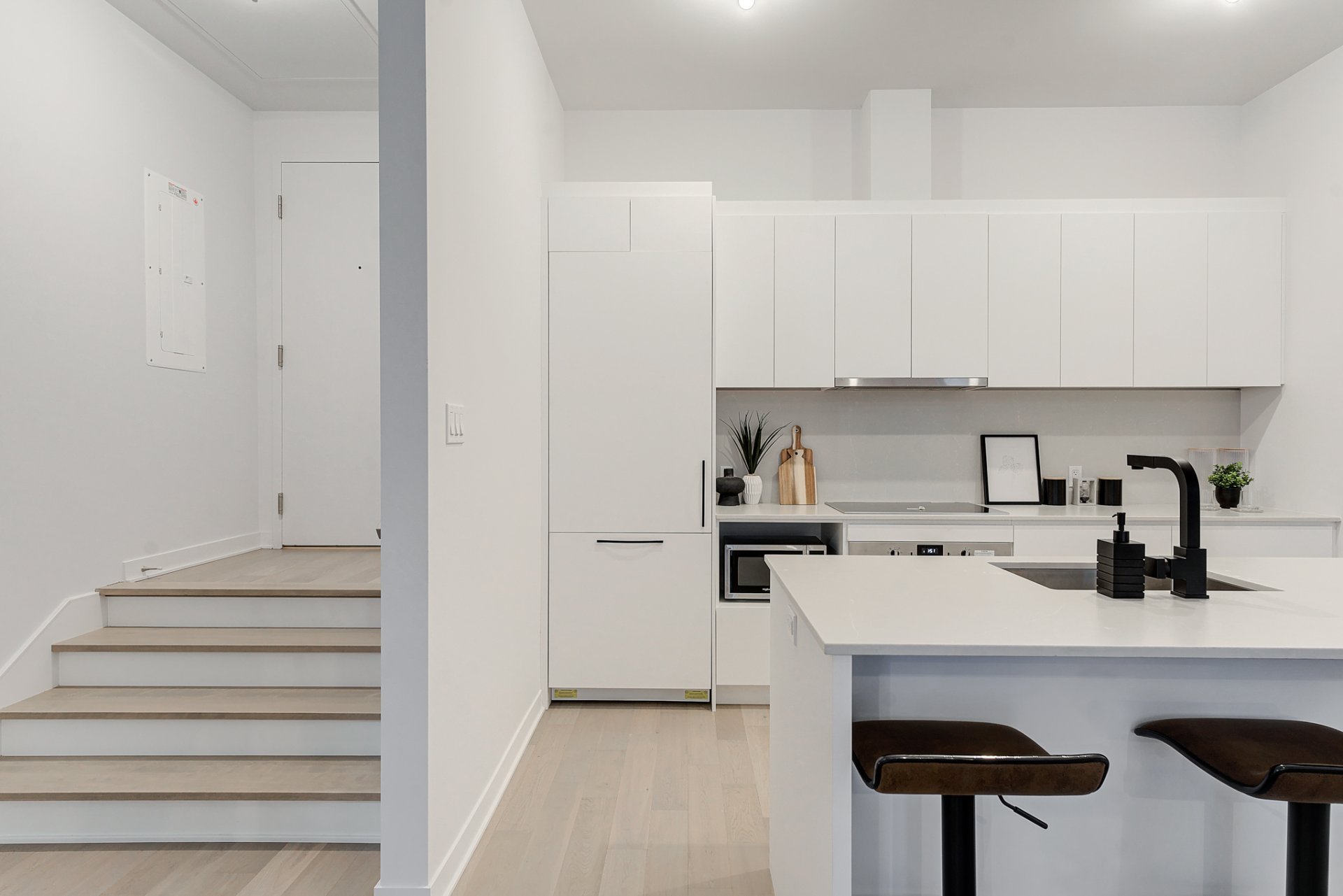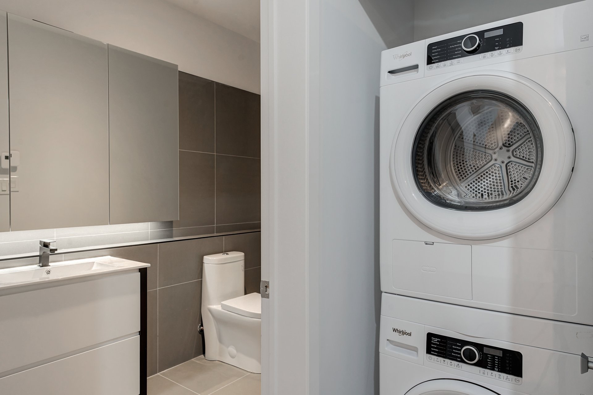 Inclus : Réfrigérateur & congélateur européens 24", Lave-vaisselle, Four encastré et plaque de cuisson européenne 24 ", Hotte de cuisine, Ensemble laveuse / sécheuse superposés de 24", Climatiseur mural. Le promoteur se réserve le droit de substituer certains éléments par d'autres de qualité équivalente.