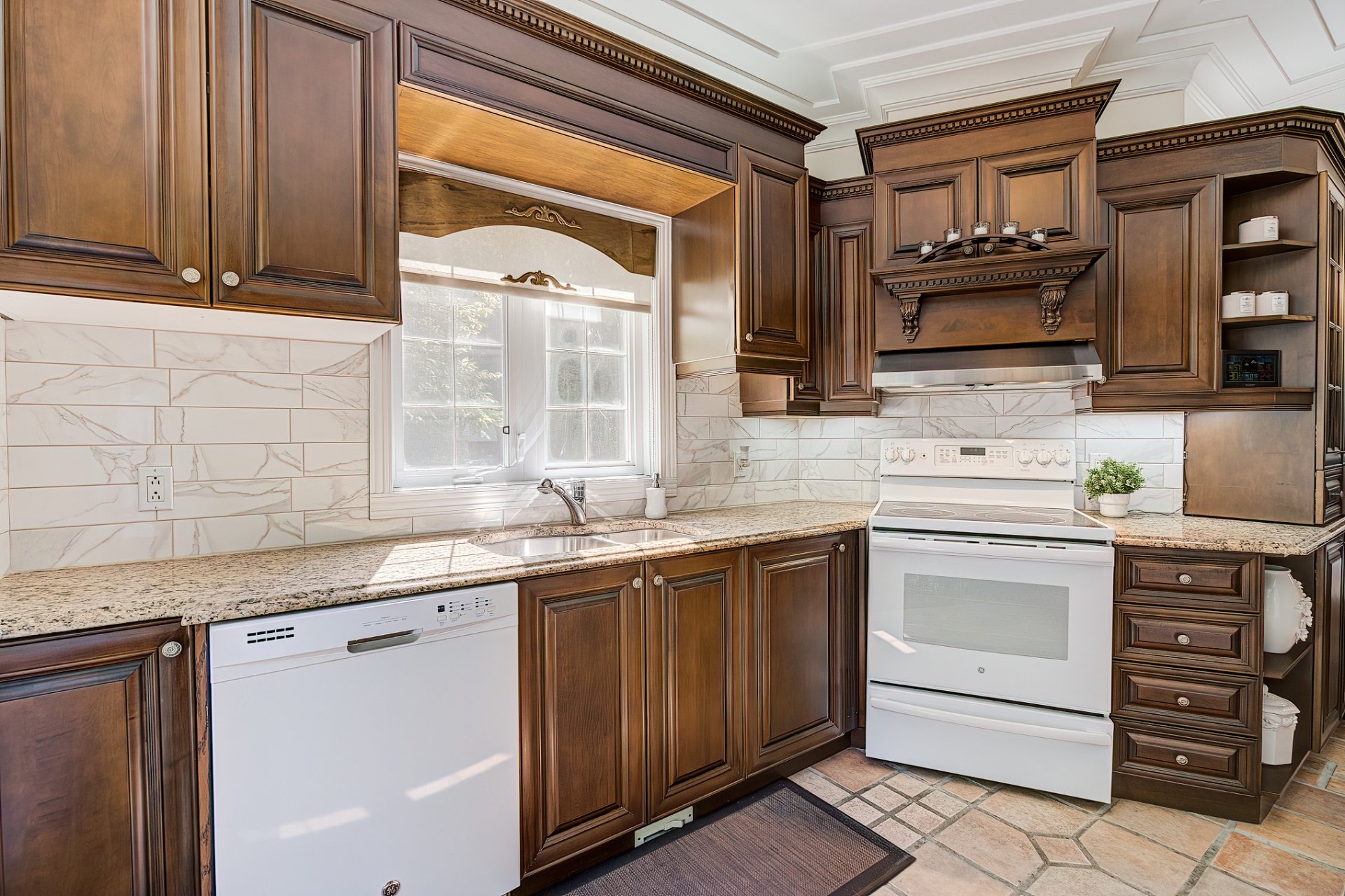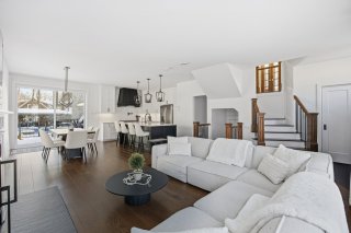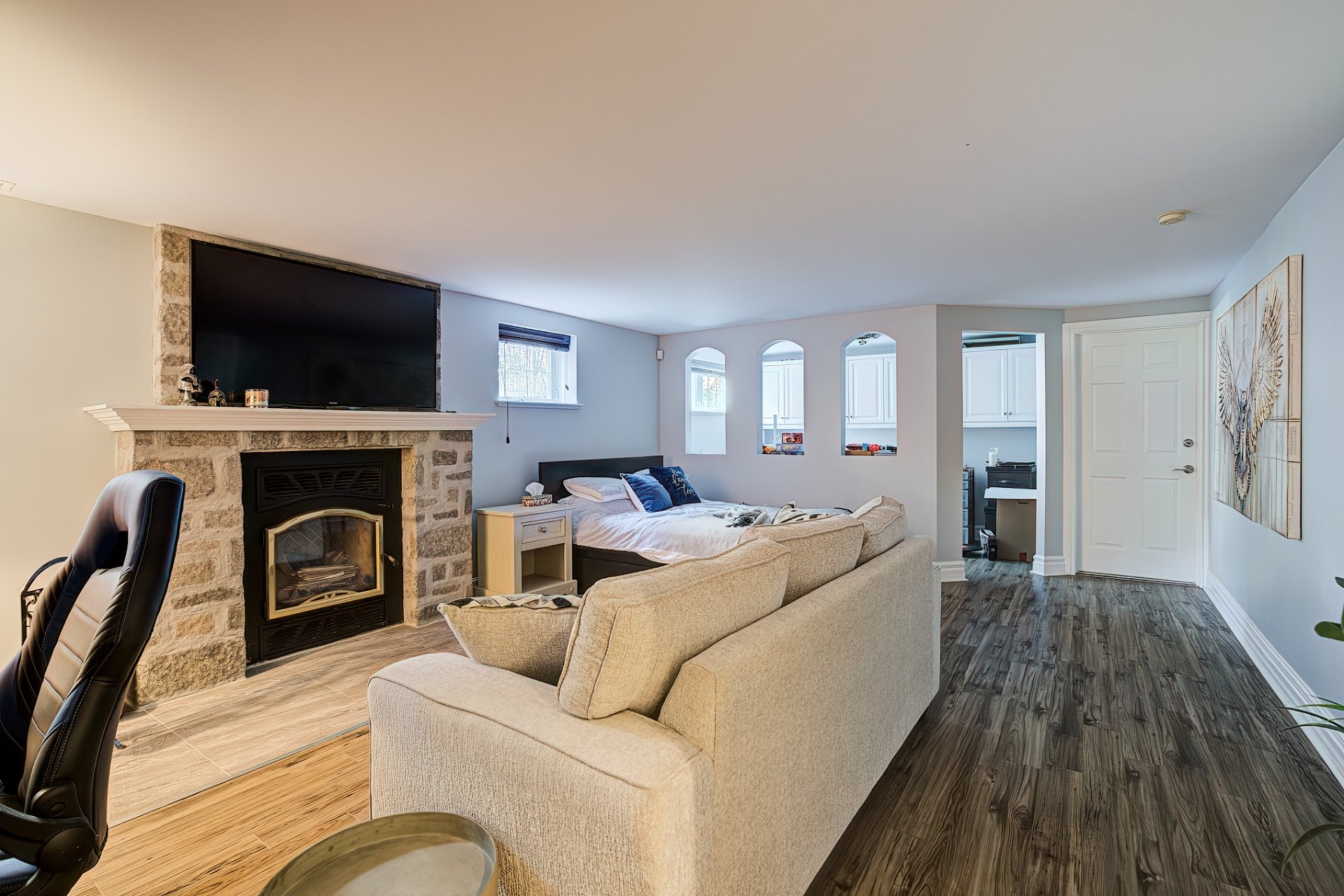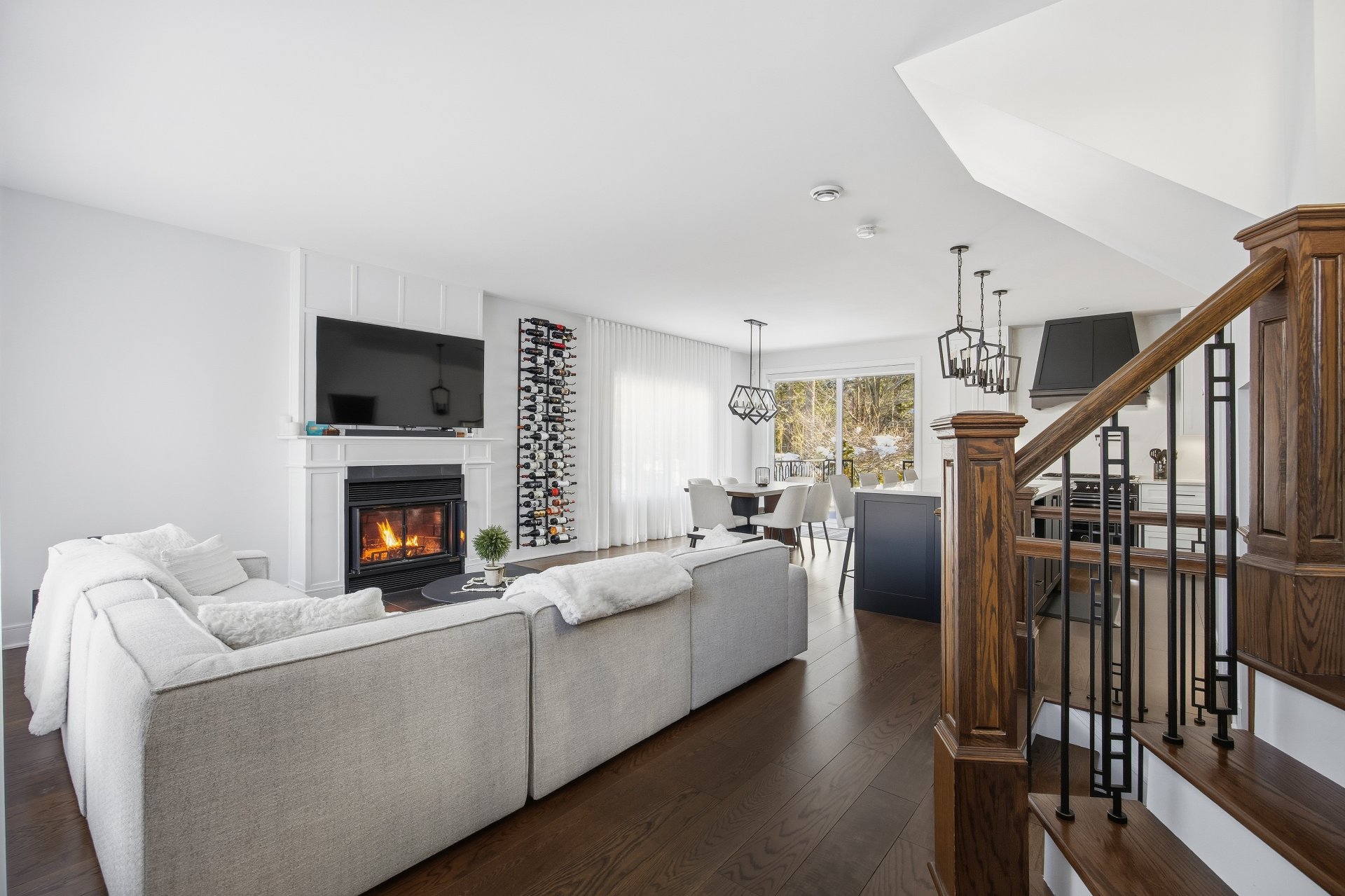 Inclus : Poêle au gas, lave-vaisselle, petit cellier, luminaire, rideaux, télés au mur, table du salon à l'étage.