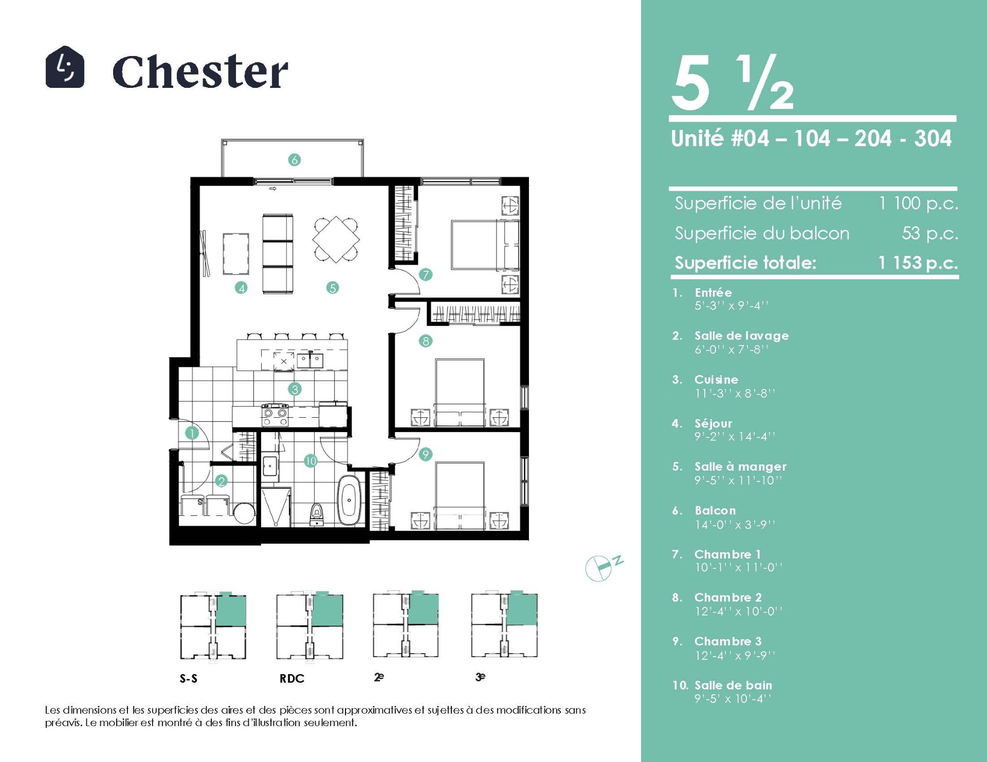 | Salon | 9.2 x 14.4 P | 3ième étage | Plancher flottant |