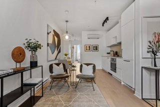 Inclus : Réfrigérateur & congélateur européens 24", Lave-vaisselle, Four encastré et plaque de cuisson européenne 24 ", Hotte de cuisine, Ensemble laveuse / sécheuse superposés de 24", Climatiseur mural. Le promoteur se réserve le droit de substituer certains éléments par d'autres de qualité équivalente.