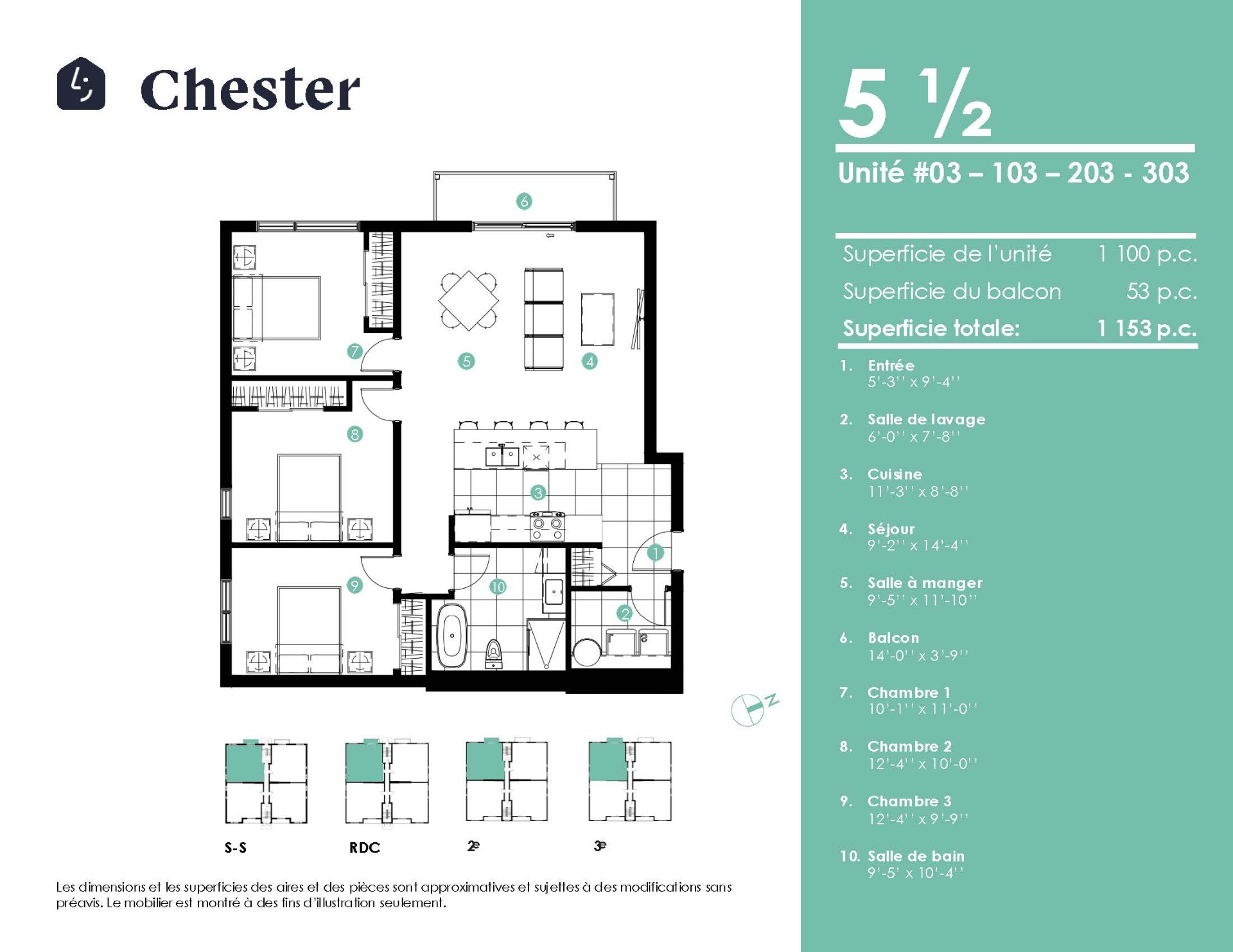 | Salon | 9.2 x 14.4 P | Rez-de-chaussée | Plancher flottant |