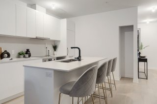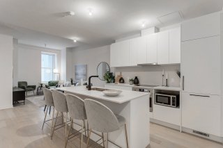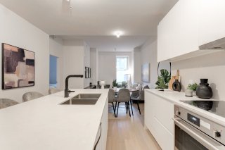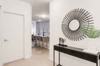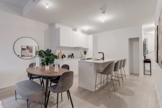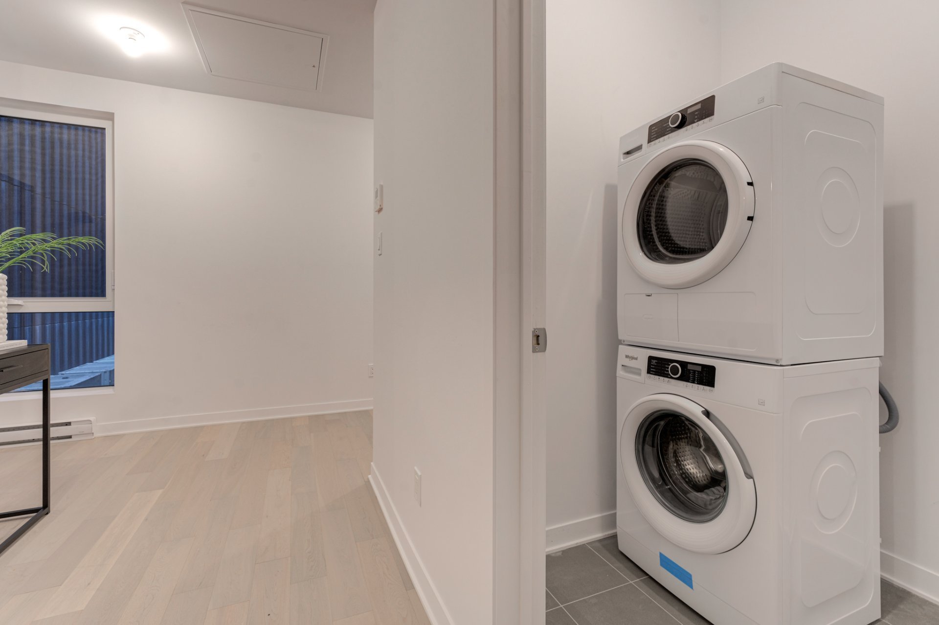 Inclus : Réfrigérateur & congélateur européens 24", Lave-vaisselle, Four encastré et plaque de cuisson européenne 24 ", Hotte de cuisine, Ensemble laveuse / sécheuse superposés de 24", Climatiseur mural. Le promoteur se réserve le droit de substituer certains éléments par d'autres de qualité équivalente.