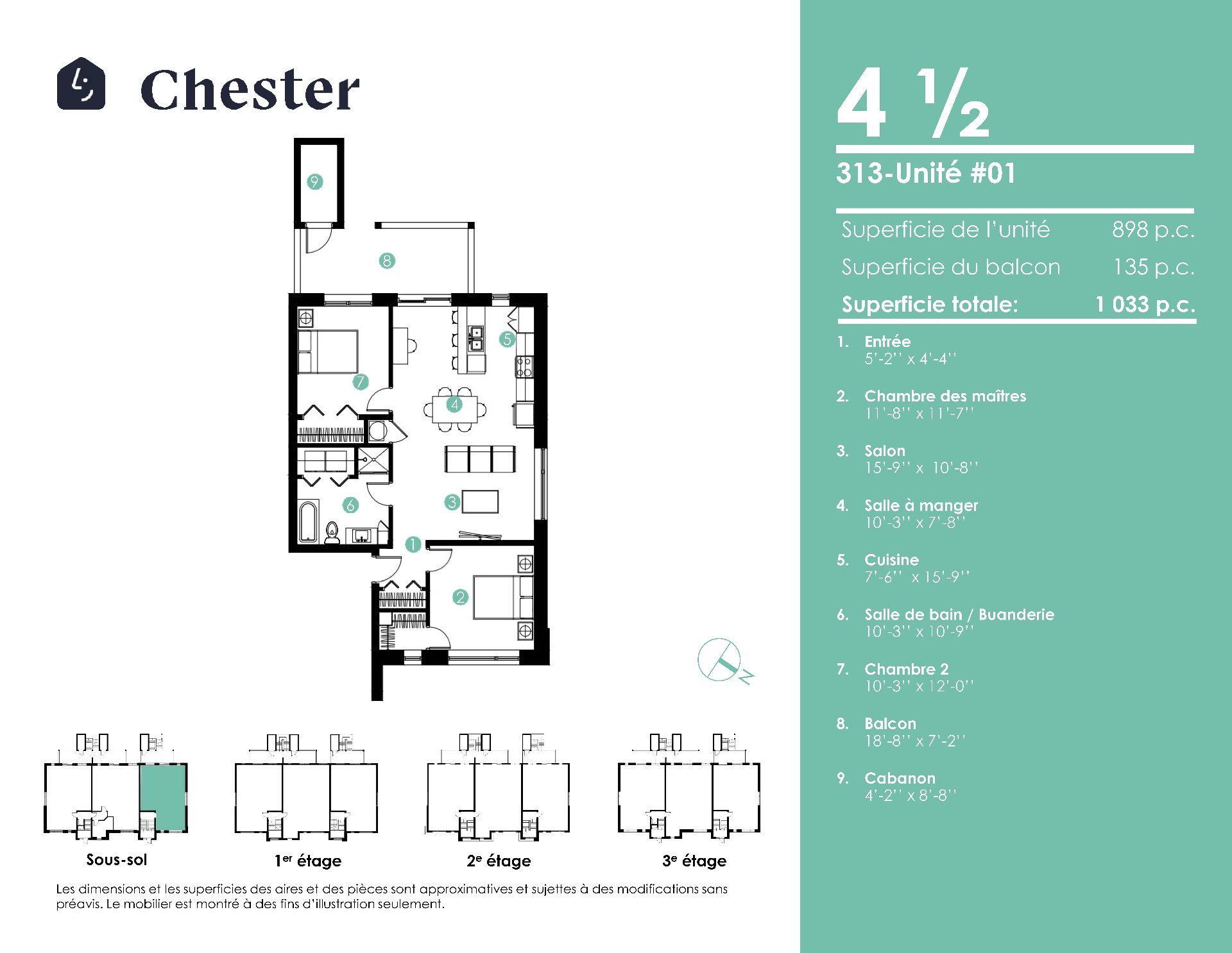 | Salle de bains | 10.3 x 10.9 P | Sous-sol | Céramique |
